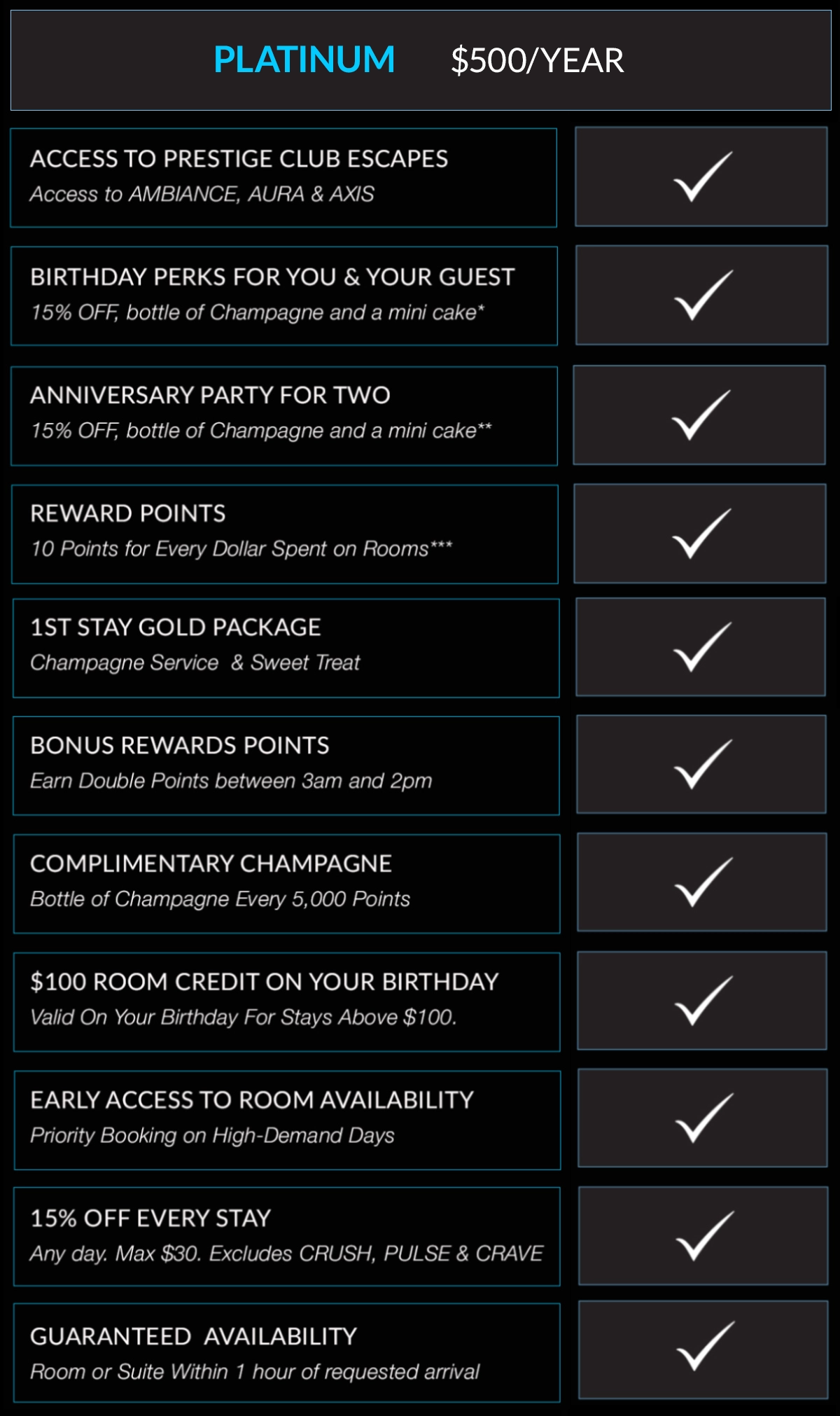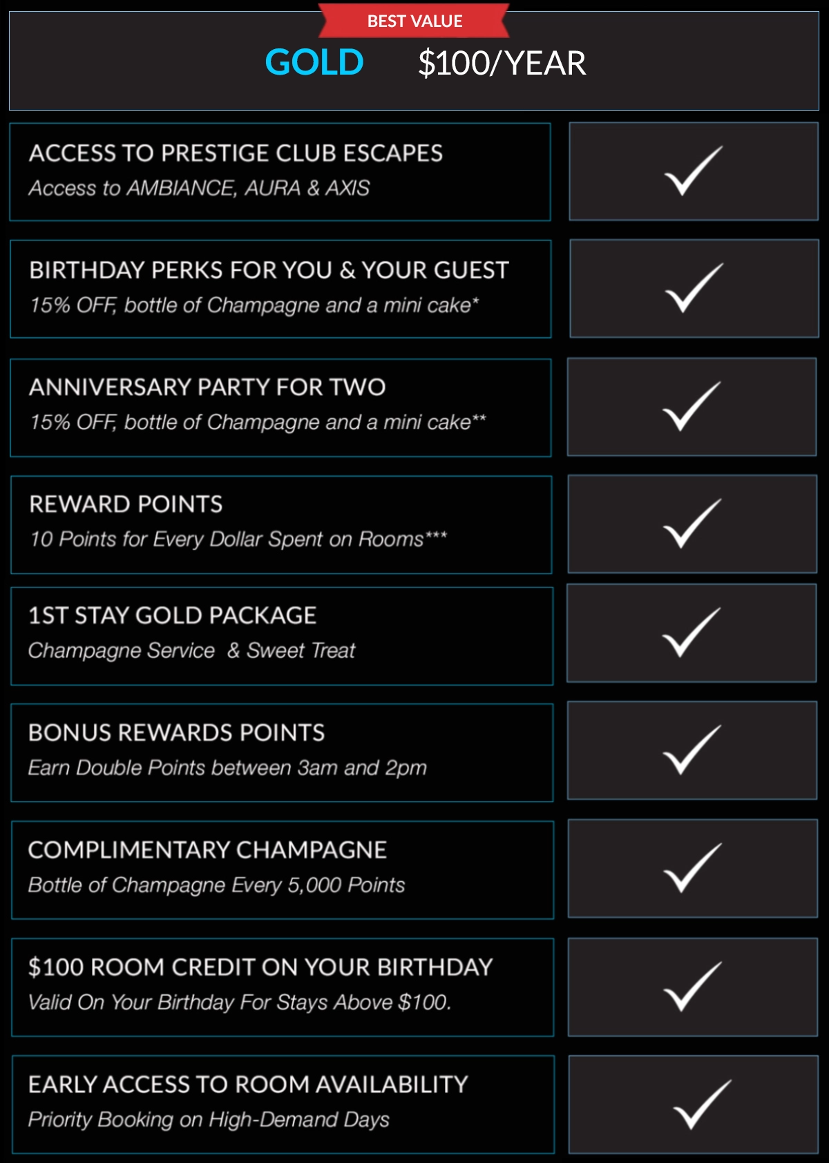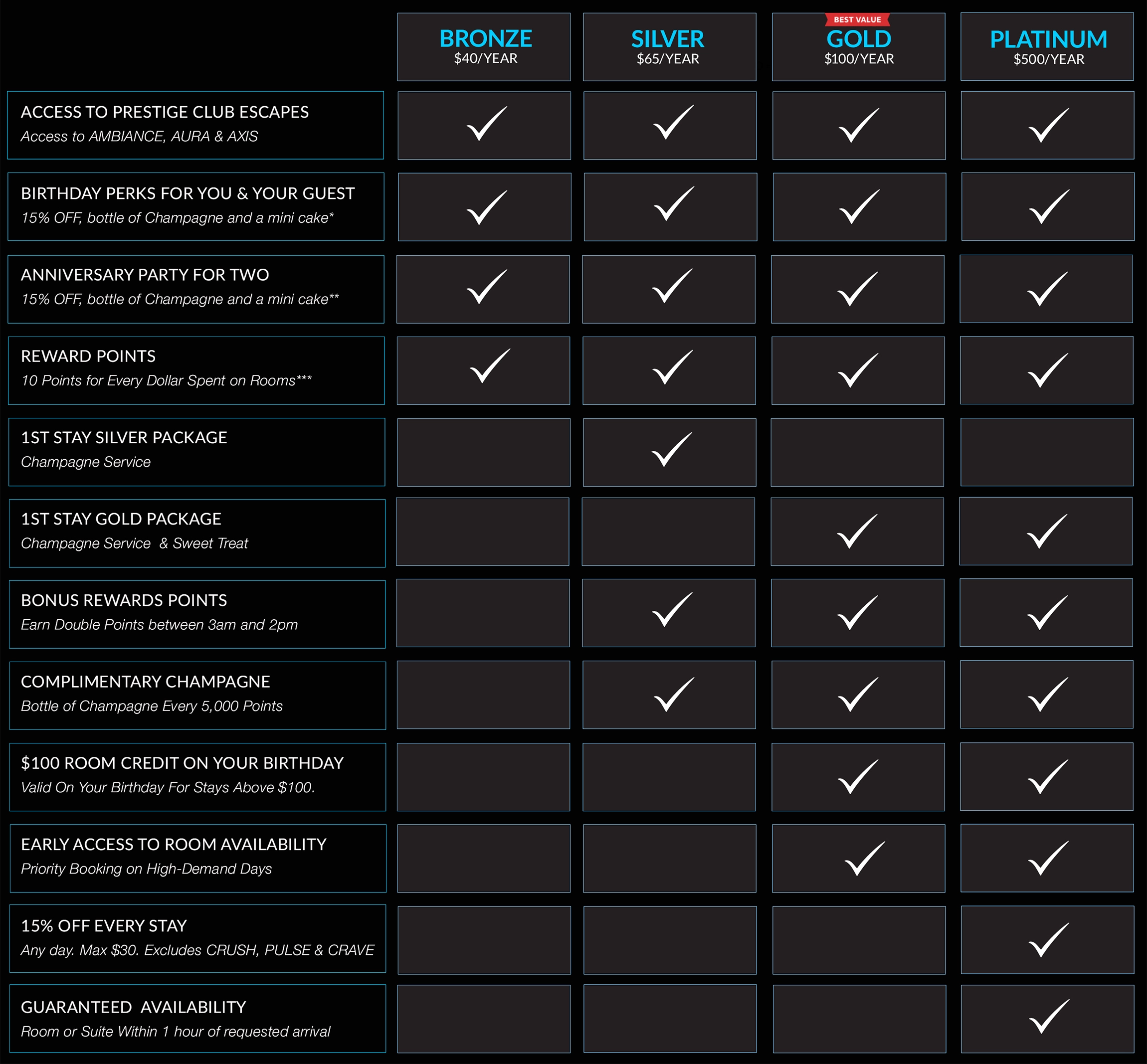 - Prestige Club is a private club that caters strictly adult couples. Membership in Prestige Club is required to stay at AMBIANCE, AURA or AXIS.